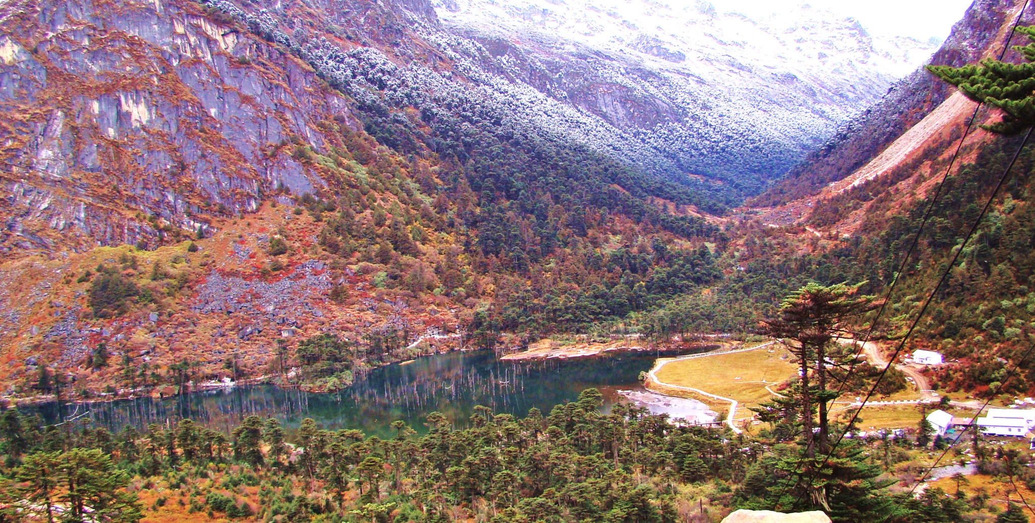 Sangetsar Lake formed at 1950 while an earthquake before there was a valley and now there are trees standing inside the water like gaurds in vigil. This lake is now known as Madhuri Lake after the Making of Film Koyla casting Madhuri Dixit in 1998. This lake is around 42 km from Tawang Headquaters, Tawang Division, Arunachal Pradesh.